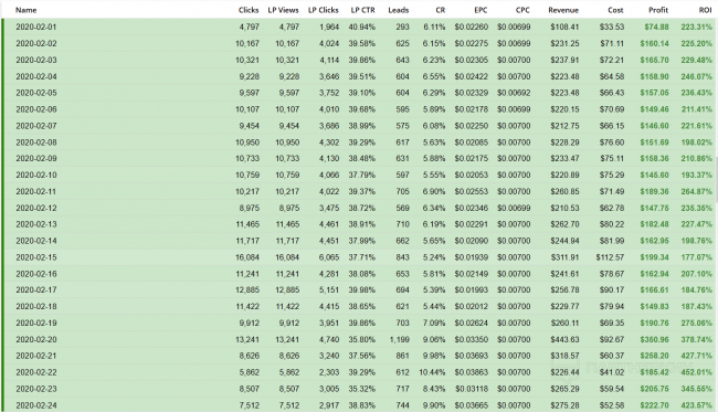 V: Да(( Если честно, то просто руки не доходили. Основное время тратил на другую вертикаль. Когда все таки решил поднажать на этот оффер, попробовал попсы и стал запускать в других нетворках, то по закону подлости он и сдох =))) CR грохнулся, рекл выкатил какой-то апдейт, в общем все стало просто затухать, появились общие кэпы на оффер. В марте после масштабирования на пике было почти $700 профита дейли с ROI 400% на пушах.