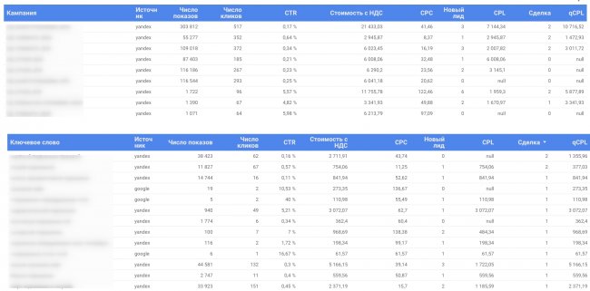 Для визуализации данных мы настроили дашборд в Google Data Studio, это позволило оценивать эффективность рекламных кампаний, объявлений, ключевых слов за любой период.