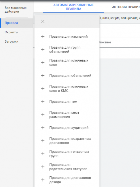 В Google Ads есть отдельный раздел для массовых действий, он доступен в меню «Инструменты и настройки». Здесь собраны все массовые действия, загрузки, скрипты и правила.
