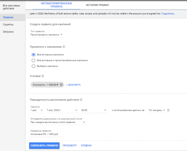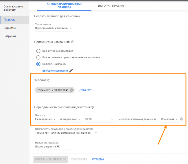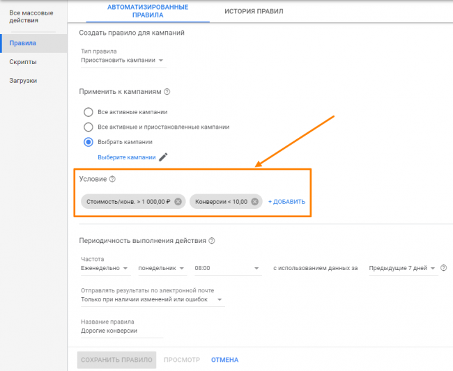 Указываем, к каким РК будем применять правило, — в моем случае ко всем активным РК. Затем задаем условие — когда стоимость больше 1000 рублей. Указываем периодичность выполнения действия, можно задать частоту: один раз, ежедневно, еженедельно или ежемесячно.