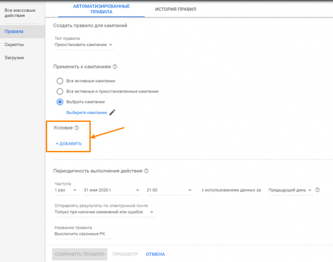 Также не забываем корректно назвать правило (в этом случае подойдет «Выключить сезонные РК»), чтобы в будущем было проще ориентироваться в созданных правилах.