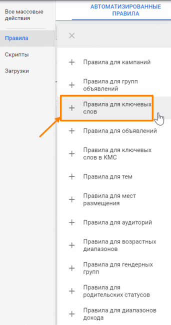 Управление KPI осуществимо также и на уровне ставок по ключевым словам. Для этого создаем правило для ключевых слов: