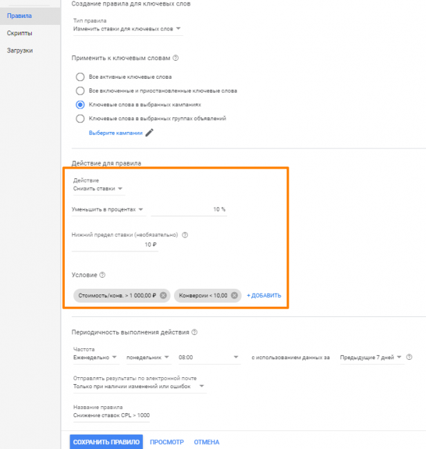 Далее по аналогии: выбираем ключевые слова в нужных кампаниях, указываем действие — снизить ставки на 10% (сразу сильно снижать или повышать не рекомендую) и задаем условие, например, «если стоимость конверсии больше 1000 рублей и конверсий менее 10 за последние семь дней».
