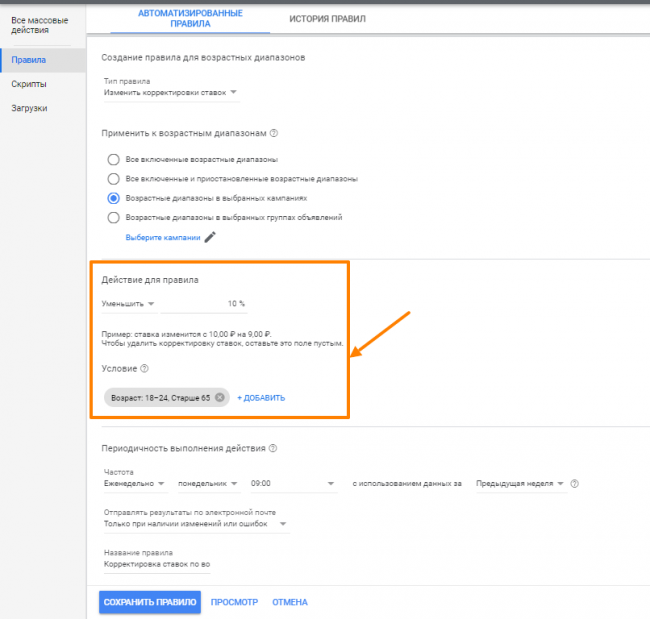 Решение: выбираем тип «Изменить корректировки ставок», в условиях выбираем нужные диапазоны возраста. Через кнопку «Добавить» можно указать дополнительные условия, например, цену или количество конверсий.