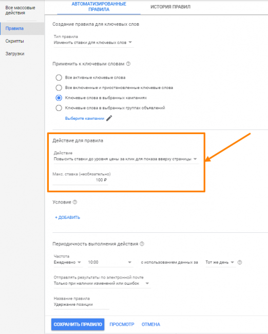 Решение: создаем правило для ключевых слов, выбираем, в каких кампаниях оно должно работать, а в действии выбираем «Повысить ставки до уровня цены за клик для показа вверху страницы».