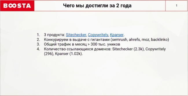 За 2 года работы команда получила внушительные результаты. Продукты конкурируют в выдаче с гигантами индустрии sео-инструментов: Semrush, Ahrefs, Moz и Backlinko. Общий трафик перевалил уже за 300 000 уникальных пользователей и продолжает расти, а количество ссылающихся доноров более 2 тысяч.