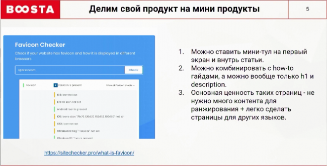 Первый способ — разделить свой продукт на мини-продукты. В один из моментов мы заметили, что пользователи анализируют страницы не целиком, а их конкретные части: мета тэги, h1, title и description. Мы добавили станицы на основе этих данных, а Google начал их хорошо ранжировать. Например, так было с Favicon Checker’ ом: мы изначально сделали информационный ленд, добавили инструмент и увидели Push-трафик. Вы можете добавлять такие мини-инструменты на первый экран, в середину статьи или комбинировать их с контентом how-to. А можете вообще делать только один to и оставлять title, h1 или description. Основная ценность таких страниц в том, что пользователь удовлетворяет свой интент, просто получая какой-то ответ от инструмента. Ему не всегда нужно читать контент. Подобные ответы можно генерировать на английском языке, а потом масштабировать их на другие языки.