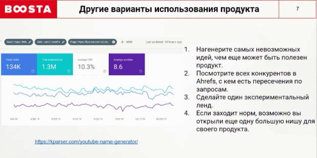 Это немного странно. Как поисковые подсказки могут помочь придумать бренд-нейм? Поэтому мы пошли немного дальше. Наш продукт не просто научил ютуберов придумывать себе бренд. Он детально объяснил, как использовать эти данные. Идея сработала. Сейчас это наш самый популярный продукт. Далее начались эксперименты с domain name generator и business name generator. Они также были успешны. Важно то, чтобы вы смотрели на свой продукт с разных сторон и пытались понять, как его можно использовать.