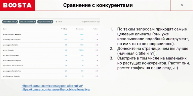 Наверняка у вашего продукта есть конкуренты. Многих пользователей они не устраивают, и юзеры будут искать альтернативу. У подобных запросов маленький объем, но самая горячая целевая аудитория. Она уже воспользовалась инструментом и осталась чем-то недовольна. Это самый теплый клиент, и вы можете его удовлетворить. Покажите ваши преимущества и отразите это в своем контенте. Не забывайте про маленьких конкурентов. Анализируйте площадки с хорошим потенциалом и копируйте их фишки. Когда они будут расти, трафик на ваш лендинг тоже будет расти.