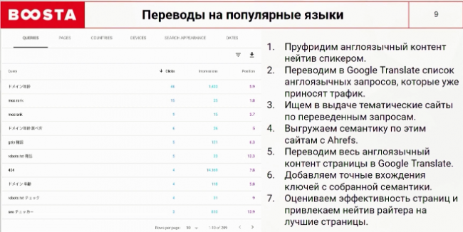 Берем свои страницы на английском языке, которые ранжируются по определенным запросам. Собираем ключевые слова и переводим их в Google Translate. Далее определяем кто из конкурентов ранжируется по этим ключам на других языках. Определяем лучшие сайты, заходим в Ahrefs и выгружаем по ним семантику. С помощью Google Translate переводим наш англоязычный контент и добавляем точное вхождение этих ключей. Анализируем работающие страницы и отдаем их в работу нейтив райтеру.