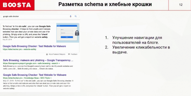 Хлебные крошки улучшают навигацию по сайту и внутреннюю перелинковку. Schema-разметка увеличивает объем сниппета. Это положительно влияет на кликабельность и конверсию.