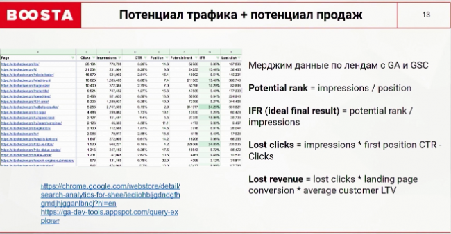 Даже контент, который хорошо ранжируется, необходимо анализировать. В этом вам помогут простые формулы и два инструмента. Соедините все версии и выгрузите данные по лендингам с консоли и Google Analytics, смерждите impressions-клики позиций и данные по проценту конверсии дохода. Далее вы определеяете лендинги с наибольшим потенциалом по трафику. С помощью этого можно расчитать потерянную прибыль по каждой странице.