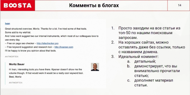 Переходим к этому способу только тогда, когда вы четко себе представляете, чем ваш инструмент лучше других. Это может быть маленький нюанс, который важен для целевой аудитории. На него необходимо делать упор в каждом сообщении. Берем ключи, по которым ранжируется ваша площадка и идем в поиск. Отобрав 150 сайтов, смотрим, где можно оставить осмысленные комментарии. Осмысленные — это значит, что вы ознакомились с материалом и можете вступать в дискуссию, оставляя содержательные замечания. Только в этом случае можно оставлять ссылку. Иногда будет достаточно названия домена. Если сайт качественный и люди читают статьи, то трафик пойдет по прямым вхождениям.