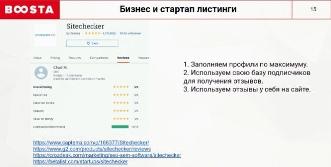 Обязательный пункт для saas продуктов. На скриншоте ссылки на 4 ключевых сайта, на которых вам нужно быть. Просто максимально заполняете профили. На этих площадках люди редко оставляют отзывы по своему желанию. Чаще всего это делают за скидочные карты, которые эти сервисы предоставляют. С другой стороны, у вас будут отзывы, которые можно смело размещать.