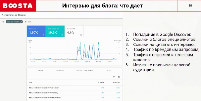 Сперва мы запустили формат интервью в экспериментальном формате. Поняли, что это работает и начали развивать направление. Начали с англоязычных специалистов, затем перешли к русскоязычным. Часть статей попала в Google Discover — это сервис, напоминающий Яндекс.Дзен, только от Google. Благодаря этому мы получили около 2 000 новых посетителей. Также увеличился трафик по брендовым запросам на интервью с известными специалистами, у которых прокачан личный бренд. Другие сайты, когда делают обзоры топовых экспертов, часто приводят их цитаты, и, таким образом, ставят ссылки на ваши интервью.