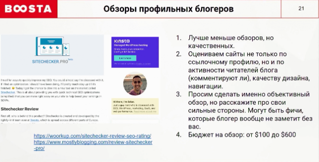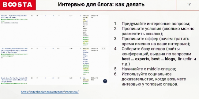 Очевидно, что качество интервью зависит от качества вопросов. Они должны быть, как минимум, интересными не только для читателей, но и для того, кто на них отвечает. Также пропишите условия интервью. В нашем оффере мы говорим, что они могут разместить ссылку на персональном сайте, но в нем должно быть определенное количество линков, чтобы не заспамить сайт и не слить вес основной ссылки по важным анкорам. Не пишите сразу слишком известным личностям в нише. Начинаем с запросов middle-специалистам. А потом используем эти материалы, как социальное доказательство того, что с нами успешно сотрудничают.