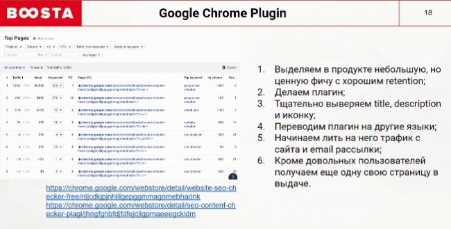 У каждого SaaS продукта есть ценные функции. Выделите ту, которой юзеры пользуются чаще всего, и превратите ее в плагин. Разберем на примере одного из наших сервисов. Мы определили, что sео-анализ — одна из самых используемых функций. При постоянном использование пользователям неудобно каждый раз копировать url и вставлять инструмент. Мы создали плагин и настроили редирект на активный url. Когда юзер кликает по плагину, он редиректит сразу на анализ этой страницы. Не забываем перевести фичу на другие языки. Из-за ограничения по количеству символов тщательно проверяем title и description. После этого можно начинать лить трафик на плагин с email-рассылок или сайта.