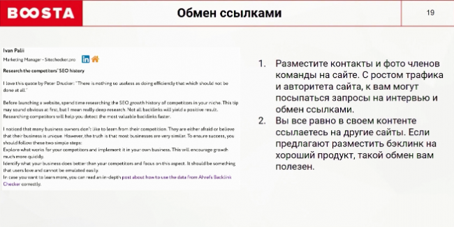 С ростом авторитета и трафика сайта к нам начали поступать различные предложения. Если вам предлагают разместить ссылку на качественный ресурс, то почему бы не использовать это, и не попросить ссылку взамен? Помним, что люди предпочитают писать конкретным людям, чем просто на почту support@. Для этого желательно разместить профили всех членов команды.