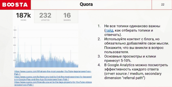 Сервис все еще работает, но есть нюансы. Один из них — правило больших чисел. Не все топики будут хорошо работать, но 5-10% ключевых принесут больше всего просмотров и кликов. По ссылкам внизу под графиком 4 ключевых ответа, которые набрали больше всего просмотров. Вы можете проанализировать, чем они отличаются от других, какая информация пользователям полезна, и за что они голосуют. Кроме того, в Google Analytics можно посмотреть, по каким топикам идут продажи конкретного ответа на Quora.