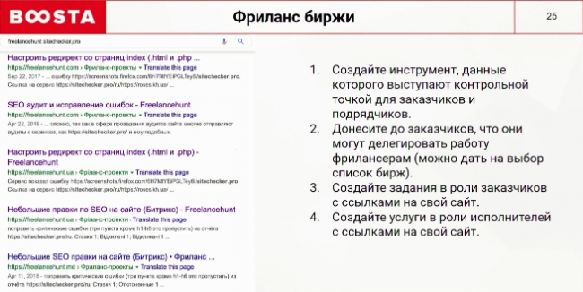Если ваш продукт участвует в длинных сделках, где присутствуют заказчик, посредник и фрилансер, можно зарегистрироваться на фриланс биржах. Например, мы поняли, что наш отчет выполняет функцию контрольной точки для заказчика и подрядчика. Остается только донести до заказчика, что он может делегировать эту работу фрилансерам. При необходимости, подготовьте список бирж, где это возможно сделать. Если вариант с заказчиком неудался, самостоятельно создайте задание с линками на свой сайт и добавьте услуги в роли исполнителя. Благодаря этому можно получить естественные ссылки с фриланс бирж.