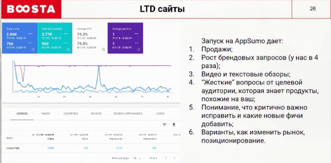 На подобных площадках продаются пожизненные подписки на ваш инструмент по низким ценам. Эта тема популярна во всем мире. На примере запуск проекта на одном из скидочных сайтов для онлайн предпринимателей AppSumo. В результате количество брендовых запросов увеличилось в 4 раза. Благодаря площадке на продукт появились статьи-гайды и видеообзоры. Подобные эксперименты улучшают взаимодействие с целевой аудиторией, которое поможет понять рынок и позиционирование продукта.