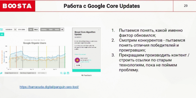 Выберите себе полезный инструмент, который накладывает все апдейты на ваш трафик. В марте 2019 года мы попали под жесткий прессинг со стороны Google. Только к концу года удалось выйти на прежние позиции. После этого, когда прилетает новый апдейт, мы прекращаем выпускать контент и строить ссылки по старым технологиям. Сперва анализируем конкурентов и смотрим на просевших в позициях. Также слушаем мнения сеошников об апдейте и только потом строим новую стратегию.