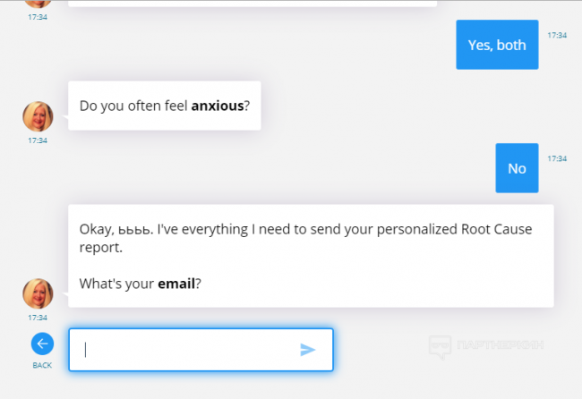 Один из интересных примеров - это прелендинг, ведущий на виртуальную переписку с экспертом, где задаются все уточняющие вопросы человеку: