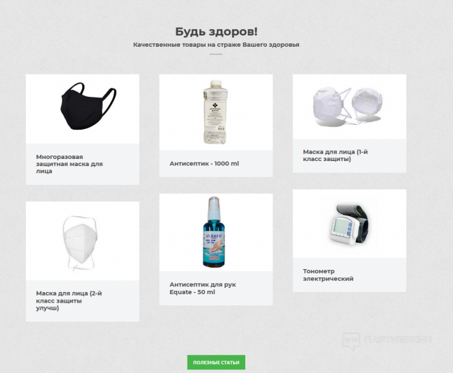 Первым делам зарегал домен, прикрутил к хосту и залил тематический текст, там пару строк, да бы страница была активна. Так как мысль была сделать витрину из нескольких товаров, принял решение сверстать быстро это все с нуля, не использовать cms-ки да бы не провоцировать роботов на применения фильтров. Набросал в начале главную страницу и разместил там 6 офферов и кнопку "статьи". Вот для наглядности приложу ниже: