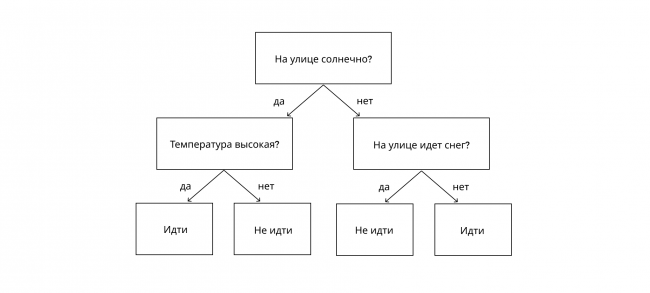 Мы неосознанно используем деревья решений, когда принимаем какое-либо решение. Например, так выглядит дерево, когда мы смотрим в окно и думаем, идти ли на улицу или лучше остаться дома: