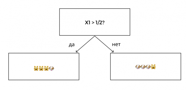 Когда мы разбили данные по признаку X1, уровень неопределенности стал ниже, но некоторая неопределенность все еще присутствует.