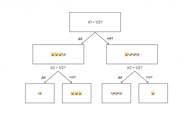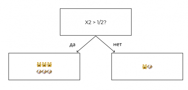 Но как алгоритм понимает, какой нужно задать вопрос? Вернемся к нашему примеру с кошками и собаками, где X1 и X2 являются признаками наших данных, а Y — значением.
