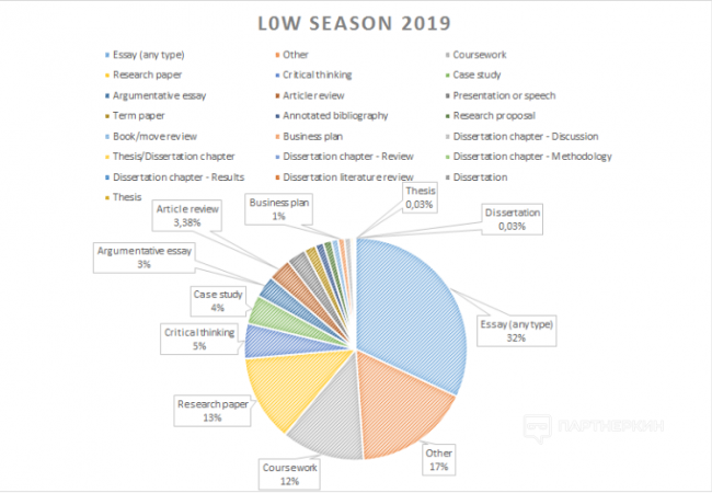 Звучит круто, понятно и правда отчасти в этом есть: работы типа thesis и dissertation действительно заказывают чаще в период летних каникул. Но делать ставку на них все же крайне неэффективно, если видеть реальную картину по объемам заказов.