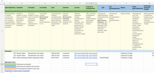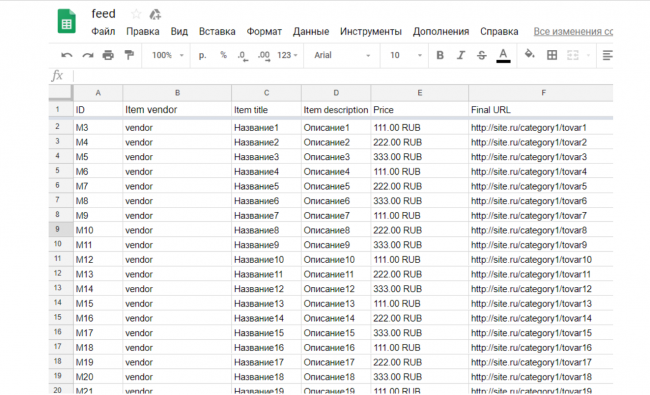 В одном из вариантов вместо фида используются Google Таблицы — такой способ подходит для интернет-магазинов с небольшим ассортиментом.