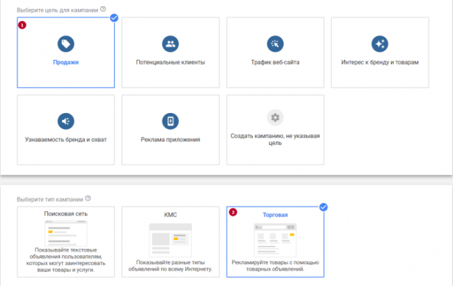 Для этого выберите целью кампании «Продажи» и тип кампании «Торговая».