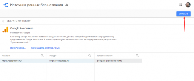 Теперь выбираем источник данных, например, Google Analytics.