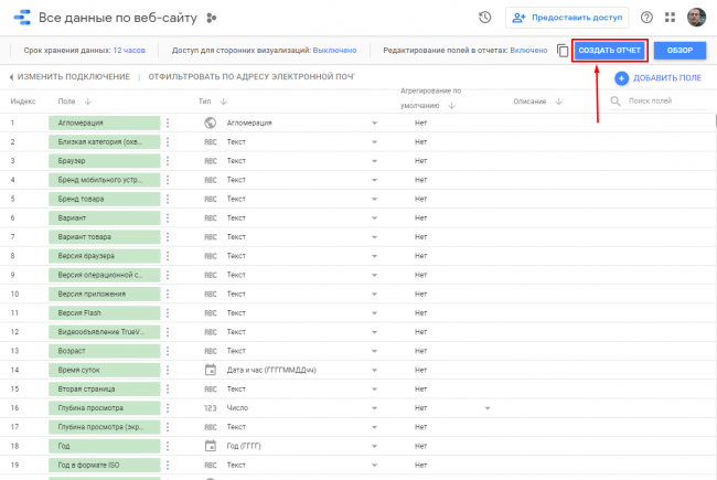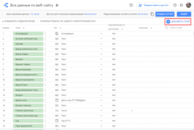 Видим свод данных, которые будут передаваться и использоваться в Data Studio, но при необходимости можно создать собственное поле (как это сделать, разберем ниже).