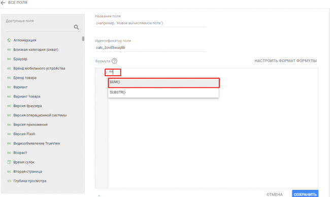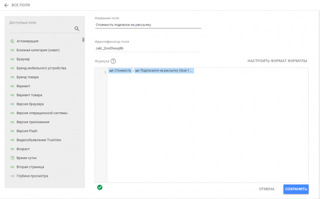 Добавление нового поля — функция, похожая на вычисляемые показатели в Google Analytics. С ее помощью можно создать новую метрику на основе уже существующих, например, цену заказа. Таким же образом можно добавлять НДС в стоимость.
