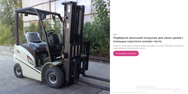 Как показывает практика, люди оставляют свои данные крайне неохотно. Нужна мотивация. Вместе с клиентом мы придумали список подарков, которые можно предложить в обмен на контакты. Сюда вошли инструменты, комплекты дополнительной резины и даже смартфоны. В сравнении с погрузчиком со средней стоимостью около 1 млн рублей — мелочь, но для «закупщика» весьма приятный бонус. Получить его можно было только при заказе погрузчика.