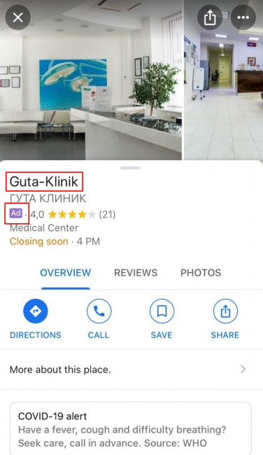 Чтобы увидеть примеры рекламных объявлений, достаточно в поисковой строке Google Карт ввести запрос «частная клиника в москве» — и в выдаче мы увидим рекламу.