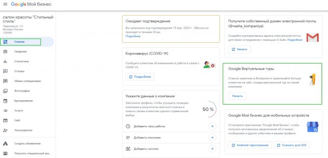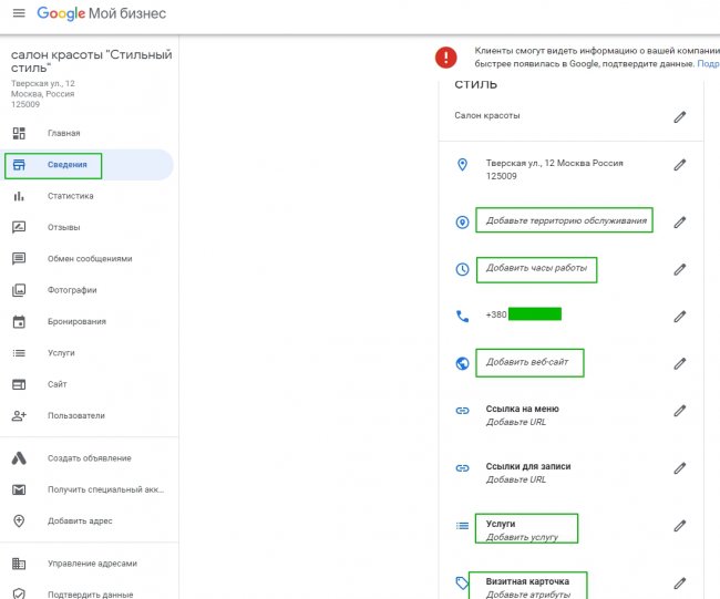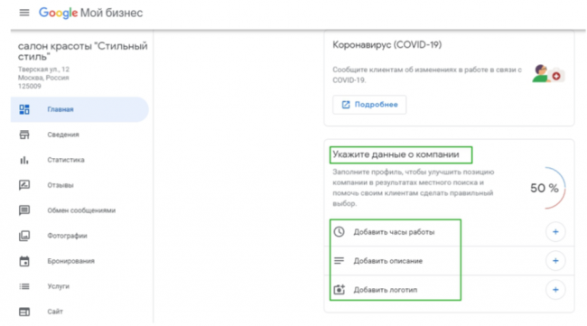 Первое, что вам необходимо сделать, — создать аккаунт в Google Мой Бизнес и добавить информацию о компании: адрес, контакты, юридическую информацию.