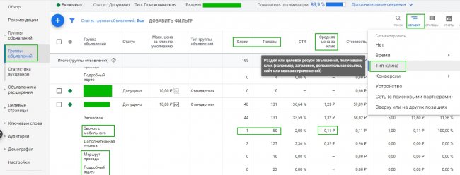 В самом Google Ads можно отследить статистику, перейдя на объявление и добавив столбец «Место клика». Вы увидите подробную статистику просмотров, переходов и стоимости клика по каждому из элементов Карт.