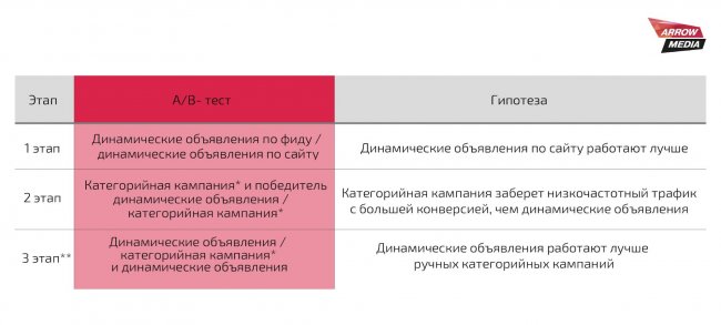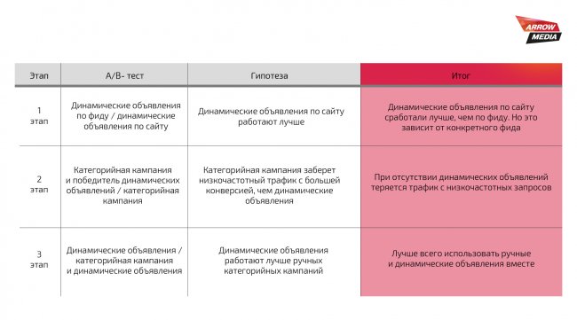 Наш многоэтапный тест доказал, что динамические объявления с правильным подходом и грамотными настройками заслуживают свое место в рекламном сплите. Отдельно повторно демонстрируем общую таблицу с гипотезами и полученными результатами.