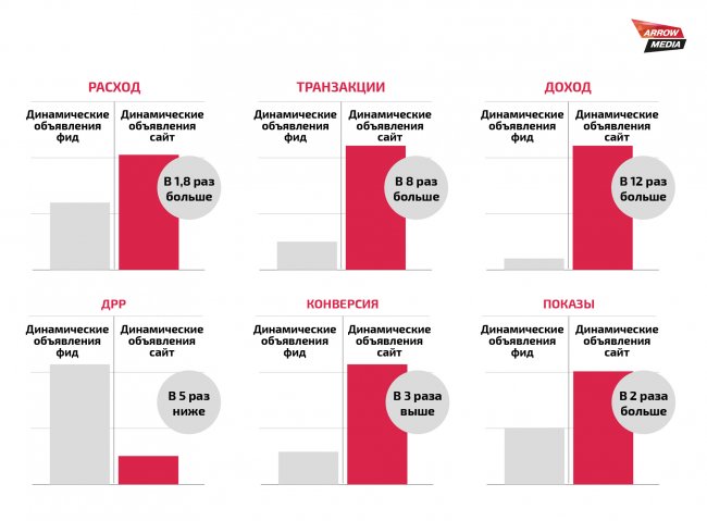 Чтобы разобраться, как следует работать с этим форматом, мы решили провести глобальный тест, в ходе которого сравнивали формирование объявлений по фиду и сайту, а также эффективность параллельной работы динамических объявлений и ручных кампаний с работой только одного из этих инструментов.