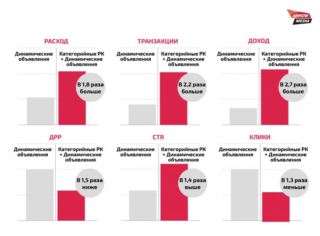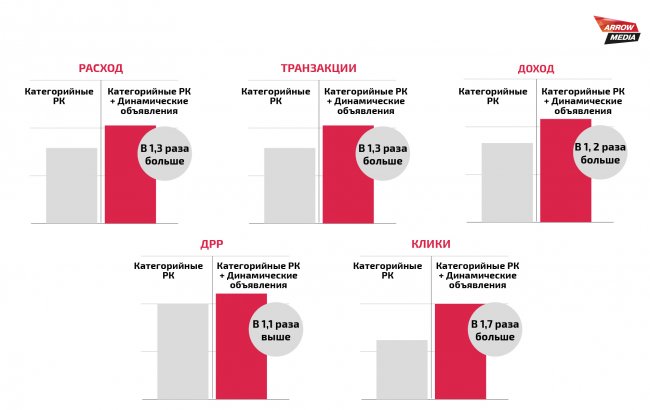 При ДРР выше на 10% мы получаем прирост в 20% к доходу. В нашем случае эта разница существенная. Динамические объявления дают дополнительный трафик (78% переходов) и доход, который при их отключении мы просто теряем.
