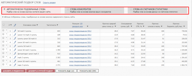 В Click.ru есть автоматический и ручной подборщики слов. Далее мы покажем: