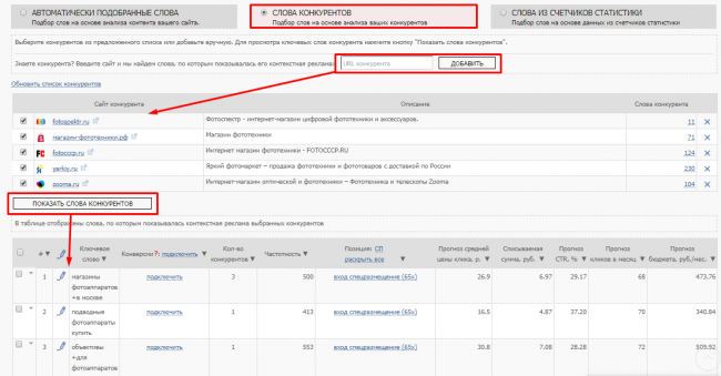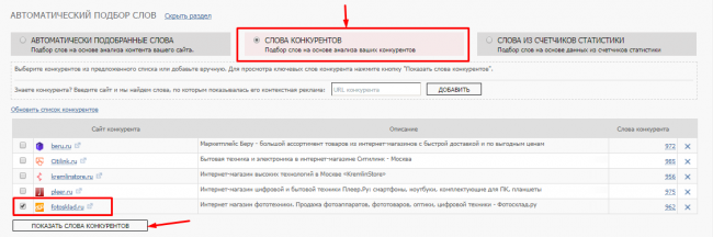 Для подбора ключевых слов выберите пункт «Слова конкурентов».