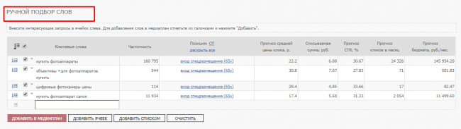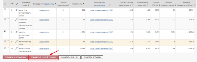 Ручной подборщик находится над таблицей с результатами автоподбора. Для добавления в ручной подборщик слов из автоподбора отметьте галочками необходимые слова и кликните на «Добавить в ручной подбор».