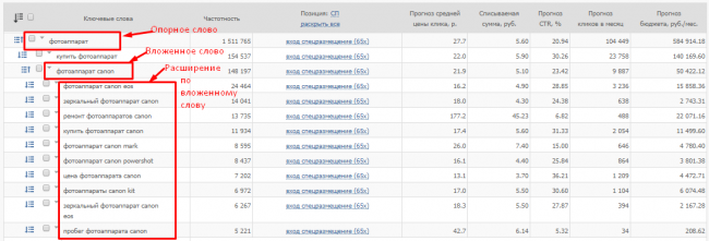 Как расширить список опорных ключей? Для этого нажмите «Развернуть список вложенных слов». Система подбирает ключи из левой колонки Вордстата, в которых присутствуют заданные в ручном подборе слова. В результате каждому опорному ключу соответствует группа вложенных запросов.