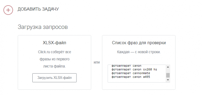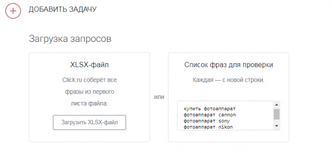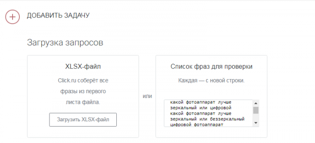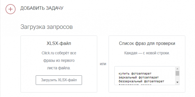 Перейдите на страницу инструмента и добавьте задачу. Введите опорные запросы удобным для вас способом (скопируйте список или подгрузите их в систему в виде XLSX-файла).