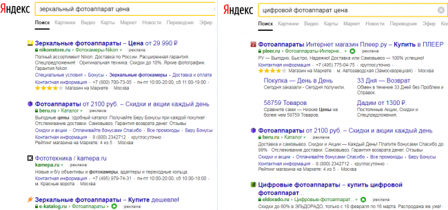 Например, есть запросы «зеркальный фотоаппарат цена» и «цифровой фотоаппарат цена». Это похожие запросы — зеркальные фотоаппараты относятся к цифровым. Так что делать с такими запросами? Можно их размещать в одной группе объявлений или нет.